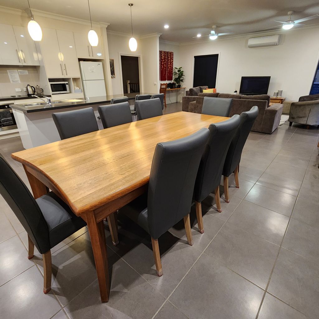 Enjoy winter days by the wood heater, summer dining on the deck, and the gardens in any season. The home includes heating and cooling throughout, electric blankets, ceiling fans, two bathrooms, wi-fi, TVs with DVD/Blu-ray, and a selection of movies and games. Family-friendly, but not suitable for children under five due to stairs.