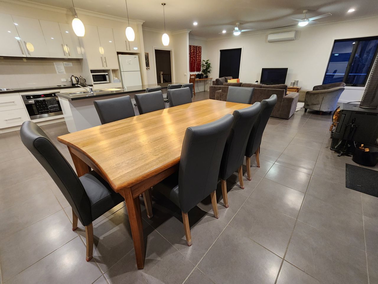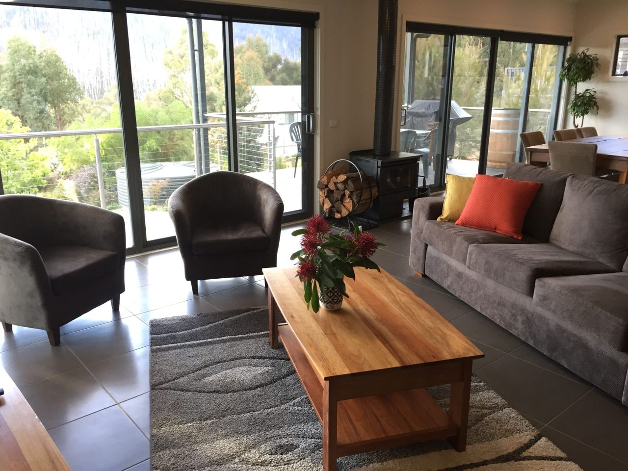 Enjoy winter days by the wood heater, summer dining on the deck, and the gardens in any season. The home includes heating and cooling throughout, electric blankets, ceiling fans, two bathrooms, wi-fi, TVs with DVD/Blu-ray, and a selection of movies and games. Family-friendly, but not suitable for children under five due to stairs.