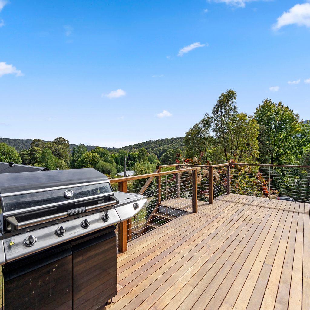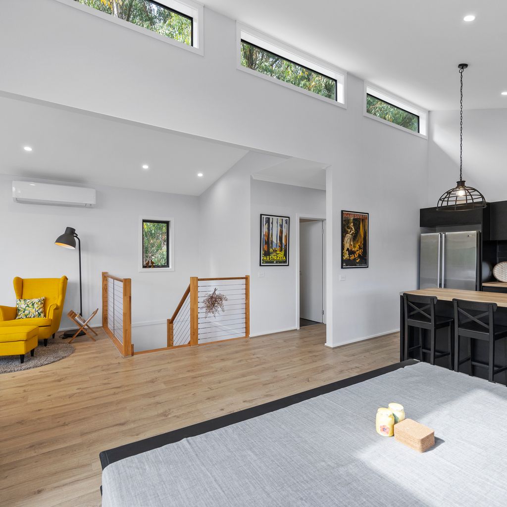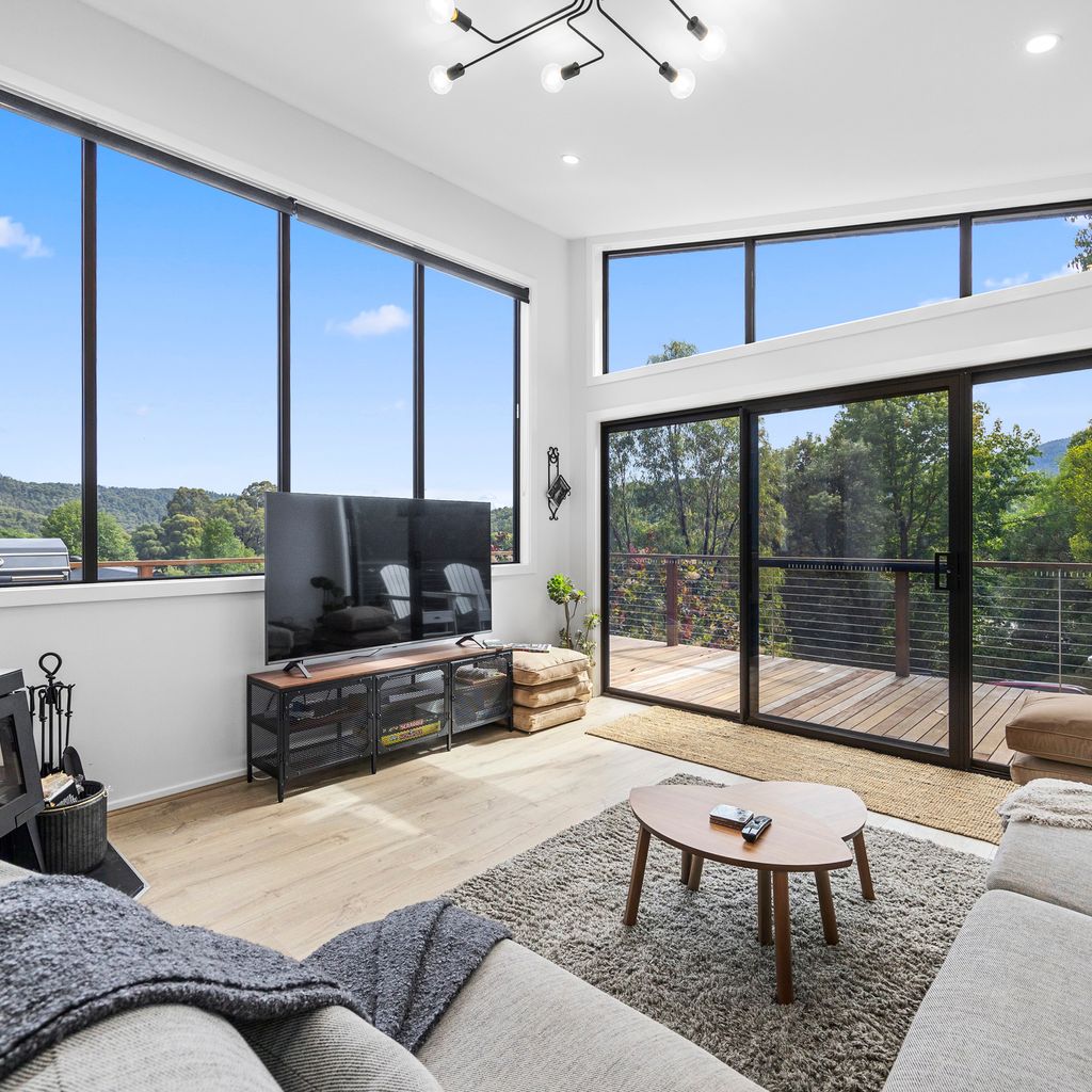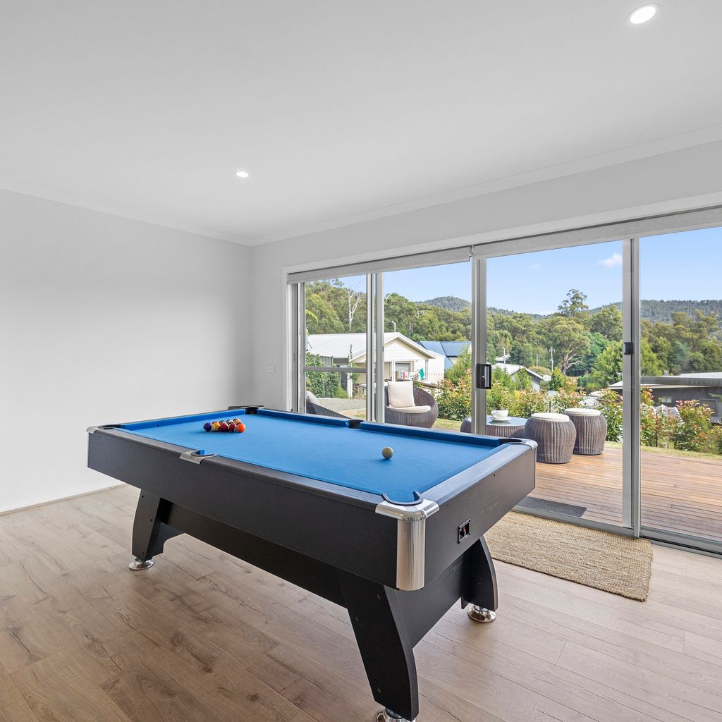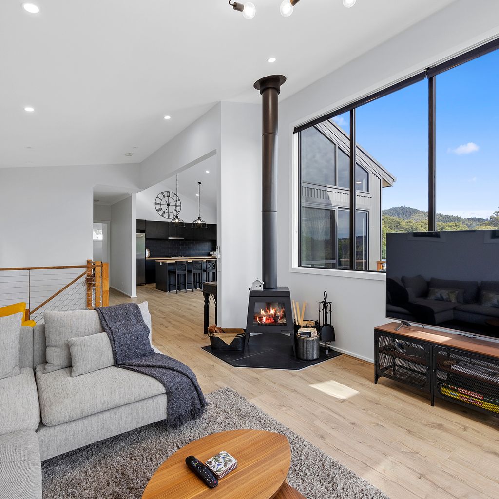 Designed for couples and families, this double-storey home features a bright open-plan living, dining, and kitchen area with high ceilings and double-height windows capturing amazing views. The fully equipped kitchen includes modern appliances and an island bench, while the lounge area offers a cozy woodfire heater and space to relax. Downstairs, enjoy a games room with a pool table and dart board, plus sliding doors leading to a wide veranda with an outdoor fire pit. Located in a quiet part of Marysville, with easy access to Stevenson Falls and the town center.