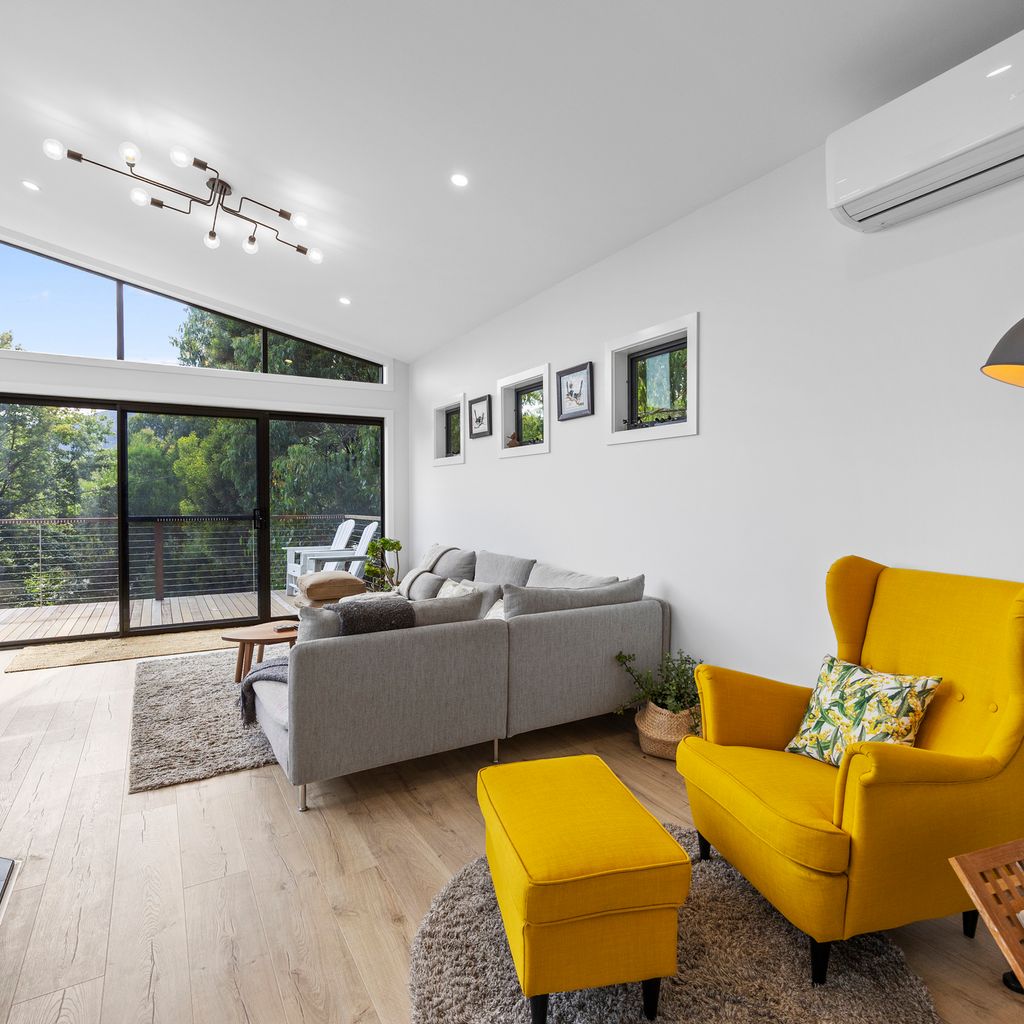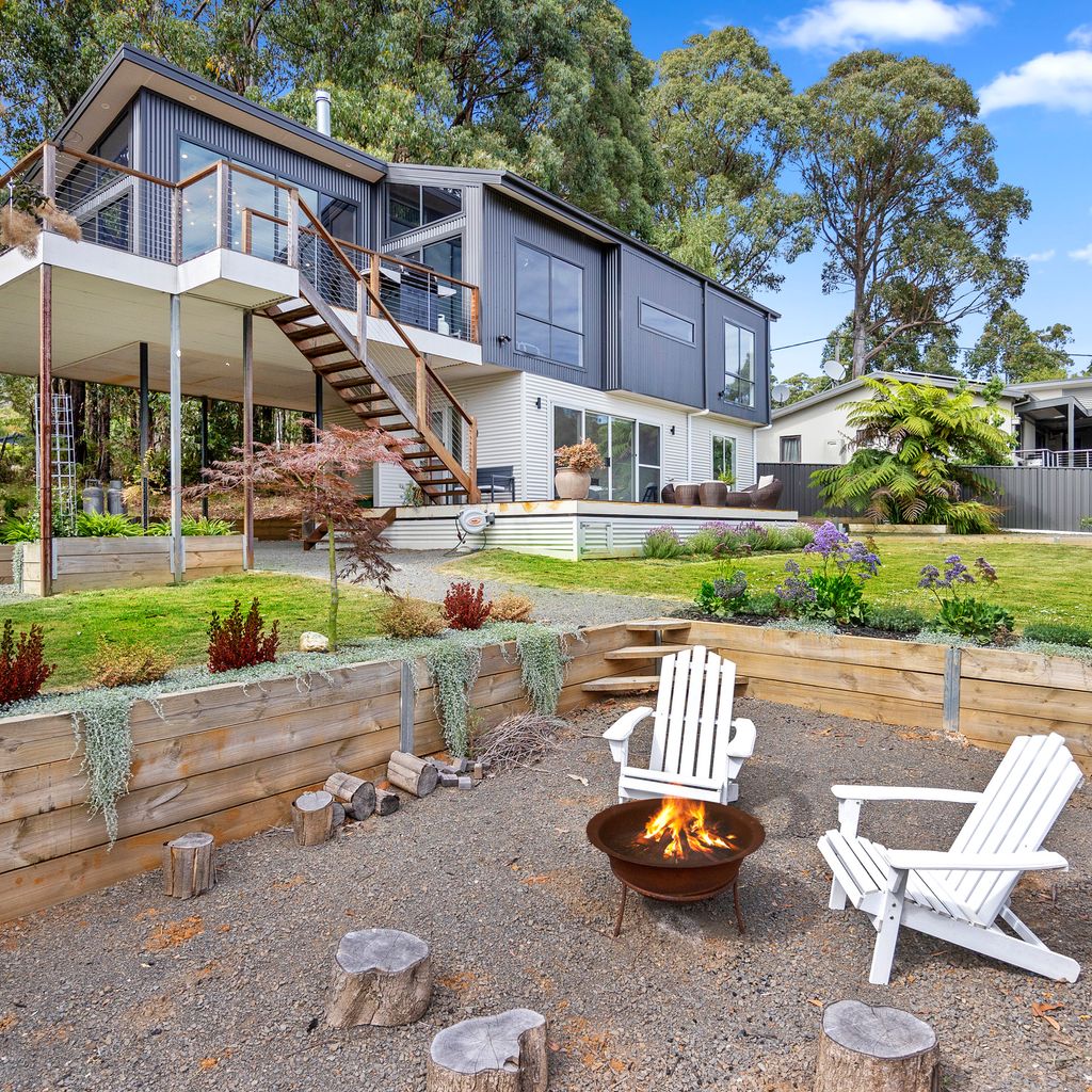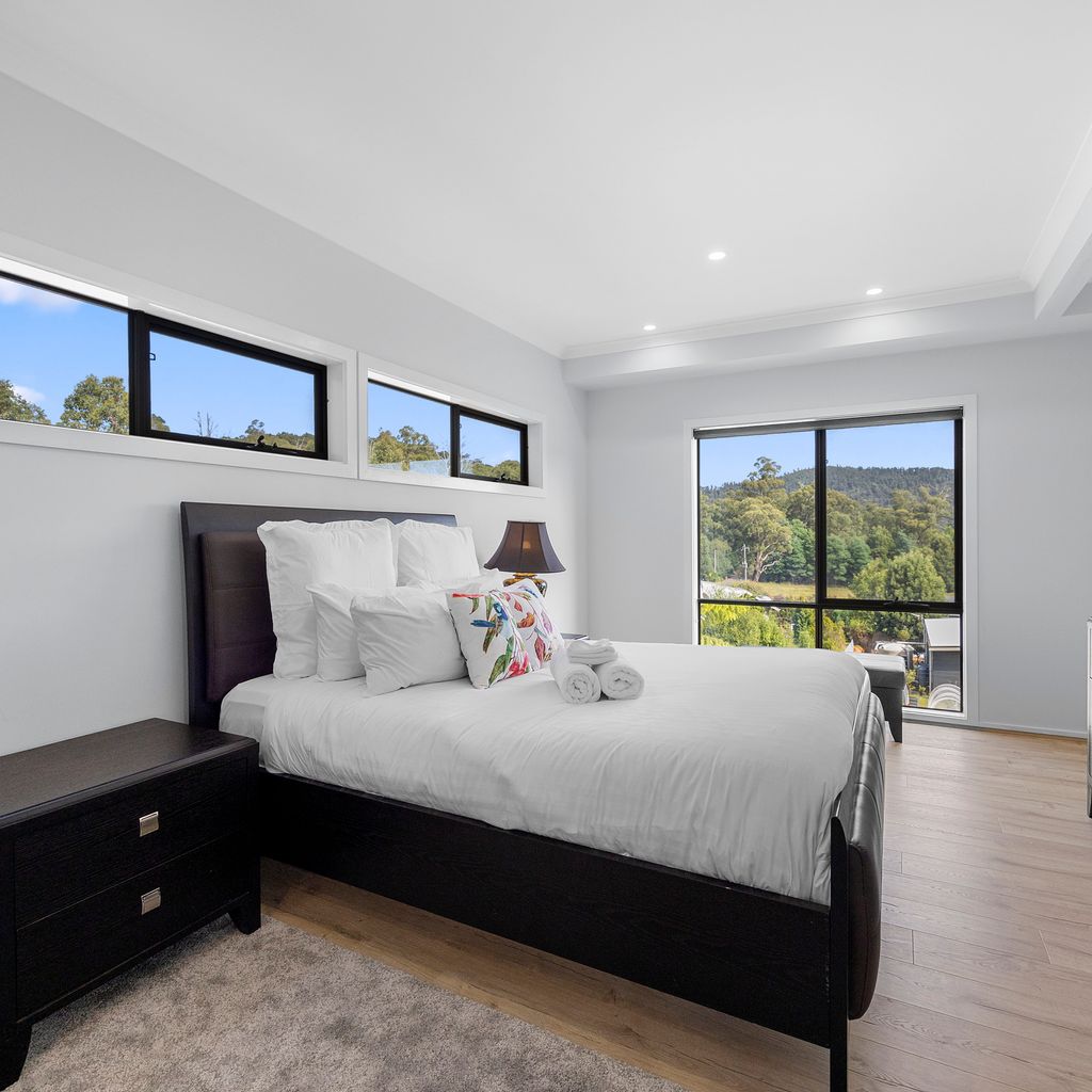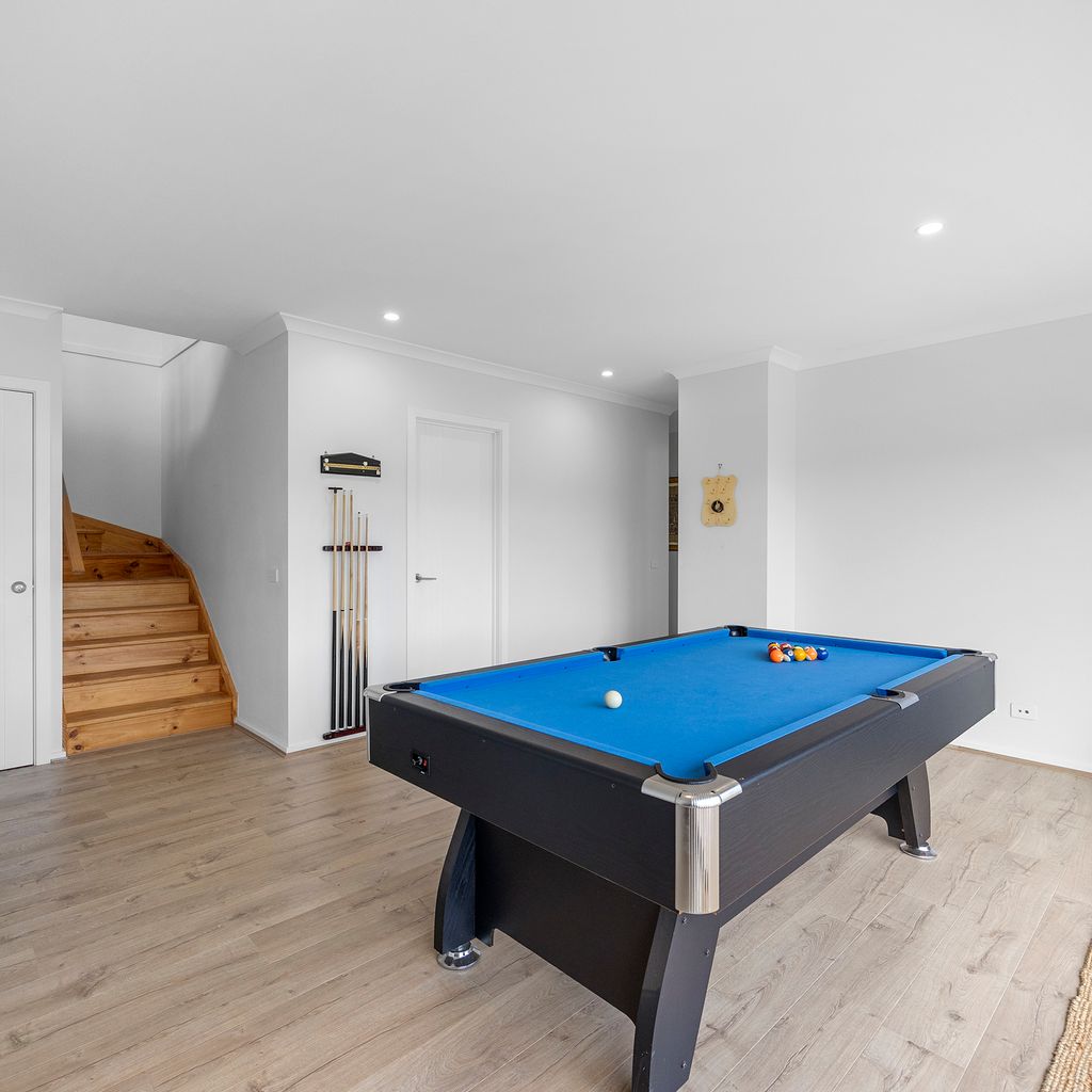 Designed for couples and families, this double-storey home features a bright open-plan living, dining, and kitchen area with high ceilings and double-height windows capturing amazing views. The fully equipped kitchen includes modern appliances and an island bench, while the lounge area offers a cozy woodfire heater and space to relax. Downstairs, enjoy a games room with a pool table and dart board, plus sliding doors leading to a wide veranda with an outdoor fire pit. Located in a quiet part of Marysville, with easy access to Stevenson Falls and the town center.