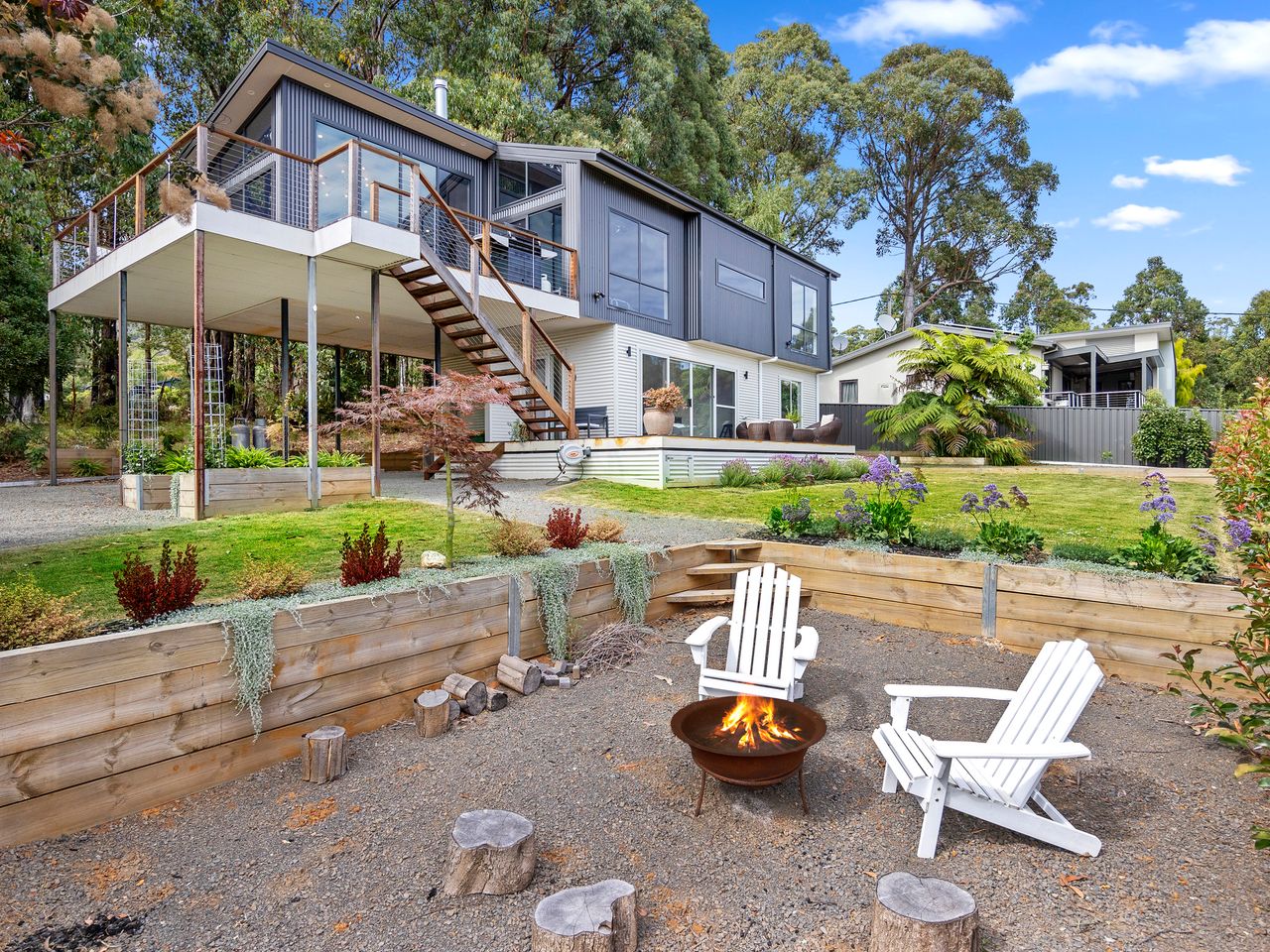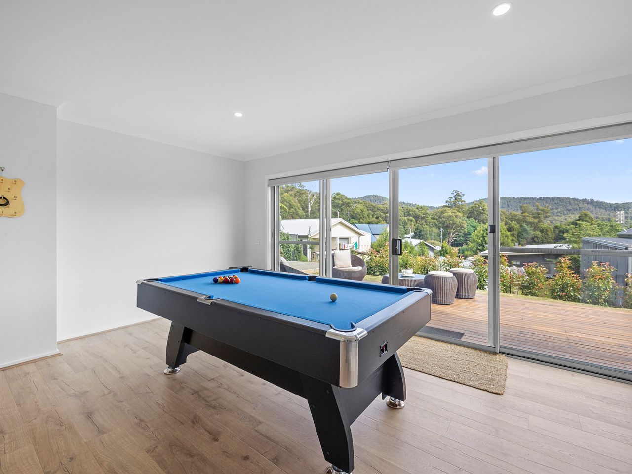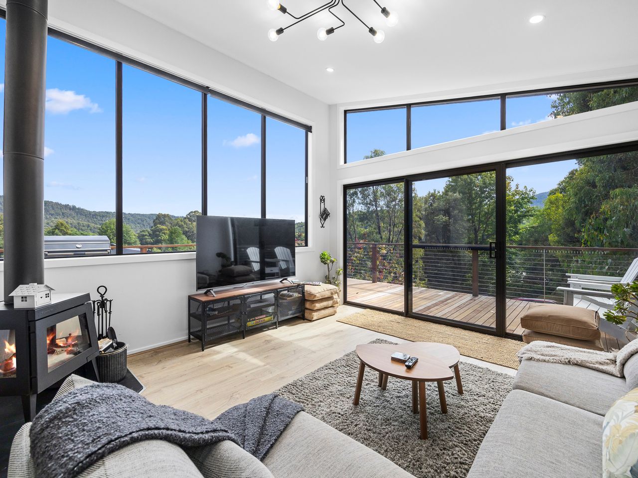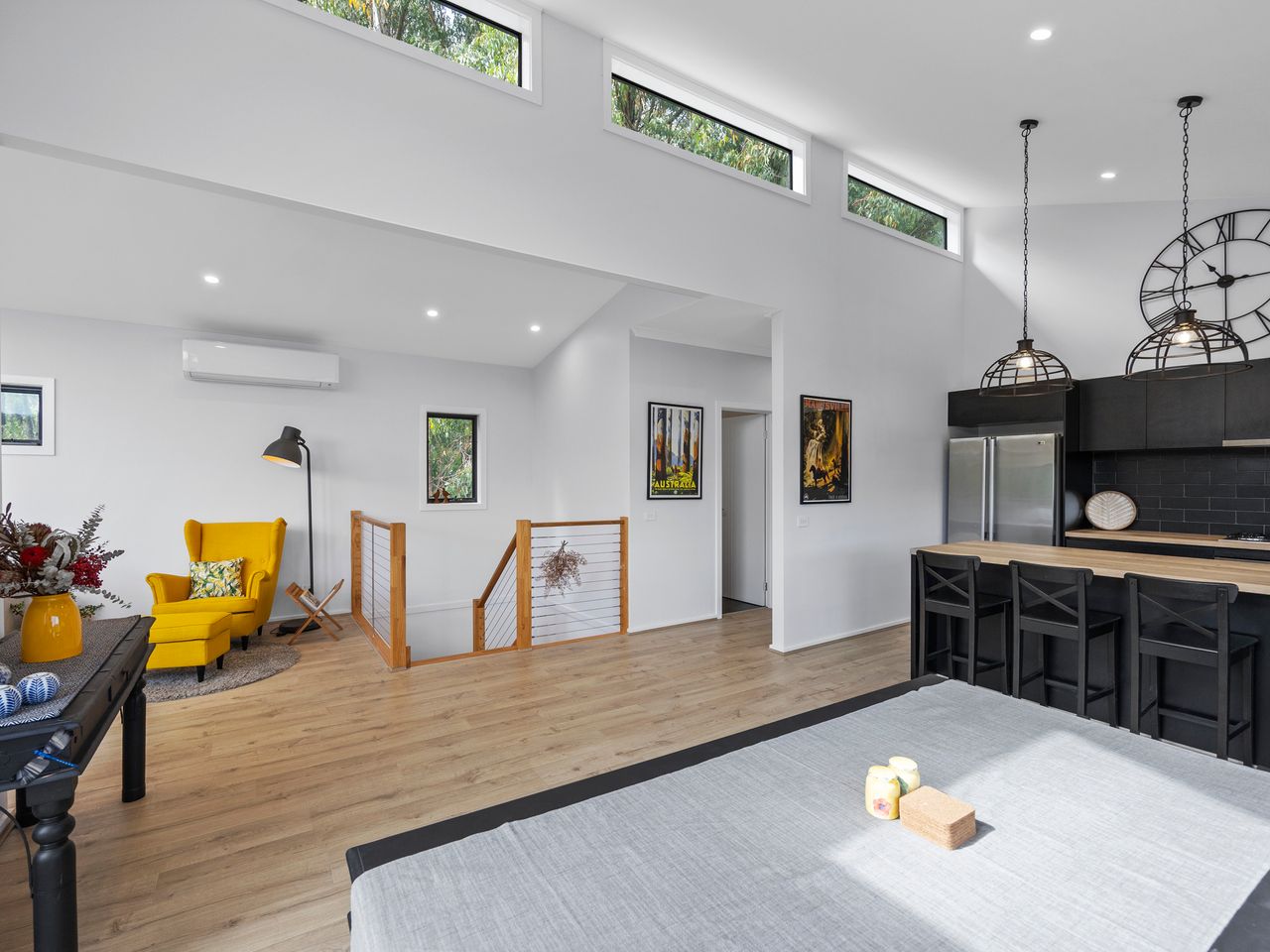 Designed for couples and families, this double-storey home features a bright open-plan living, dining, and kitchen area with high ceilings and double-height windows capturing amazing views. The fully equipped kitchen includes modern appliances and an island bench, while the lounge area offers a cozy woodfire heater and space to relax. Downstairs, enjoy a games room with a pool table and dart board, plus sliding doors leading to a wide veranda with an outdoor fire pit. Located in a quiet part of Marysville, with easy access to Stevenson Falls and the town center.