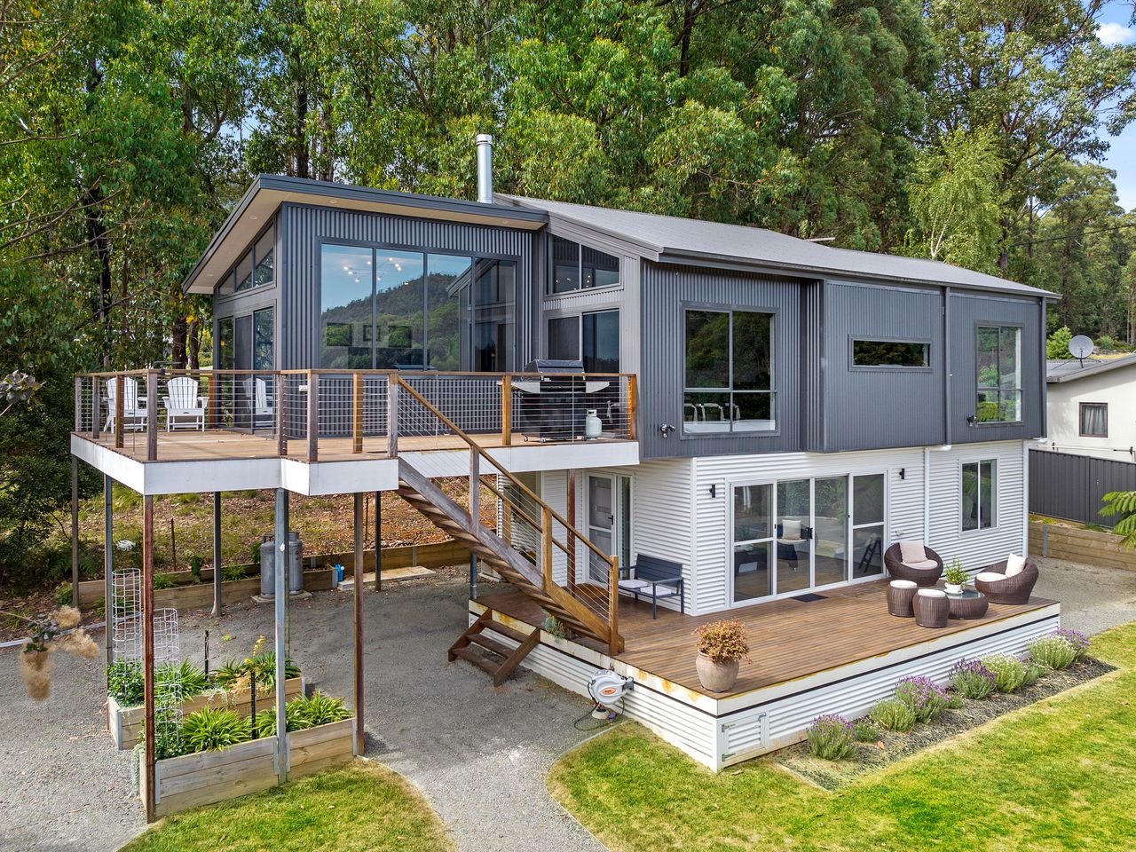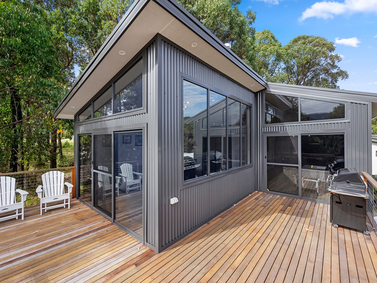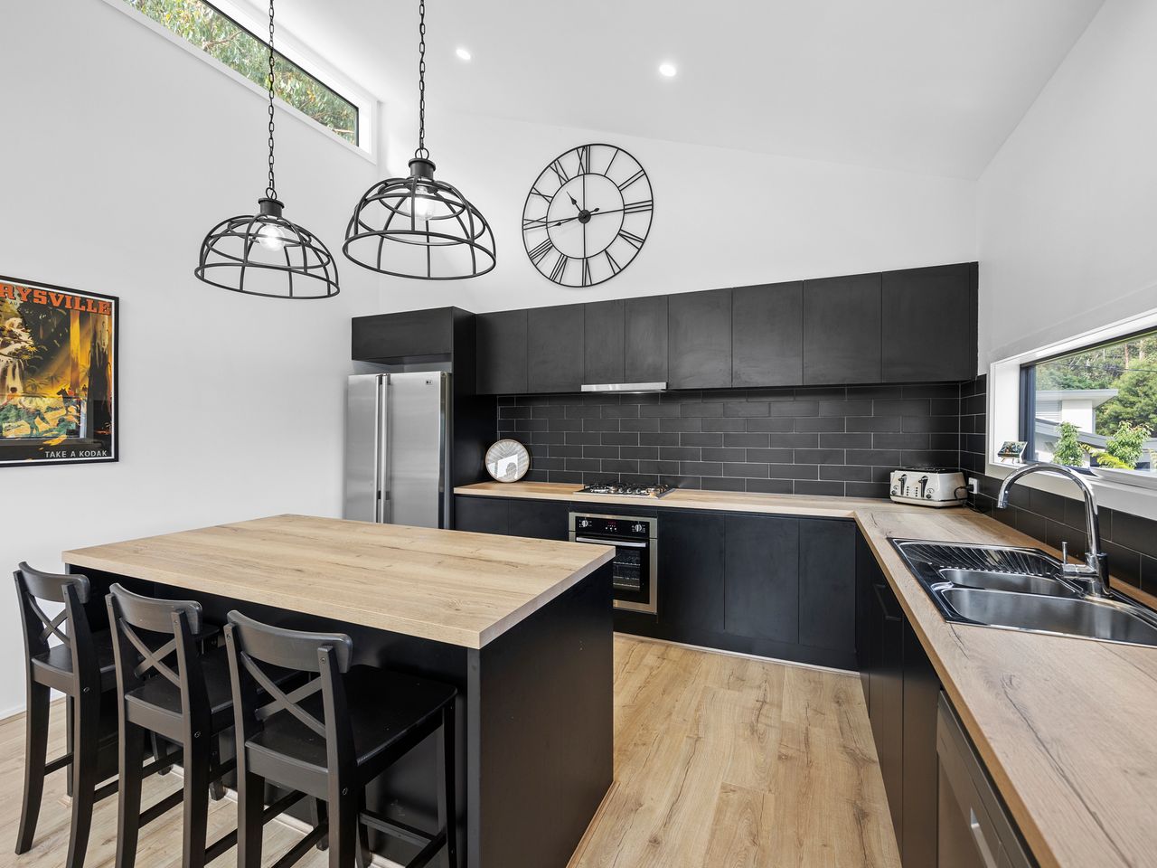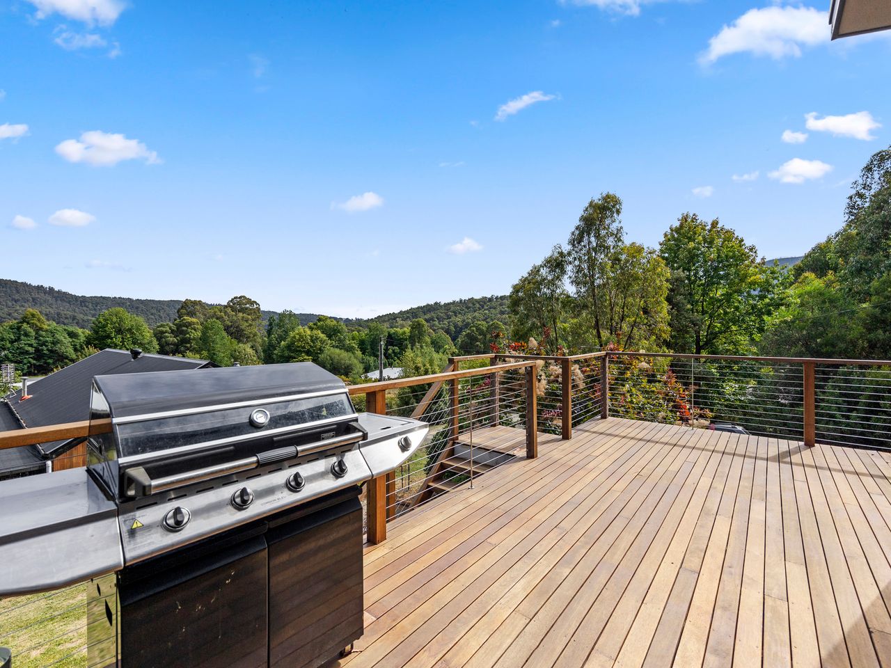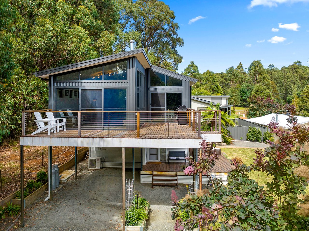 Designed for couples and families, this double-storey home features a bright open-plan living, dining, and kitchen area with high ceilings and double-height windows capturing amazing views. The fully equipped kitchen includes modern appliances and an island bench, while the lounge area offers a cozy woodfire heater and space to relax. Downstairs, enjoy a games room with a pool table and dart board, plus sliding doors leading to a wide veranda with an outdoor fire pit. Located in a quiet part of Marysville, with easy access to Stevenson Falls and the town center.